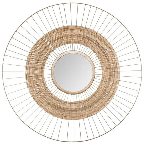 Atmosphera – Grand Miroir mural Soleil en Métal doré et Rotin tressé H 75 cm (-) Dimensions : D. 75 x Ep. 7.8 cm –
