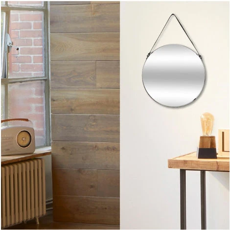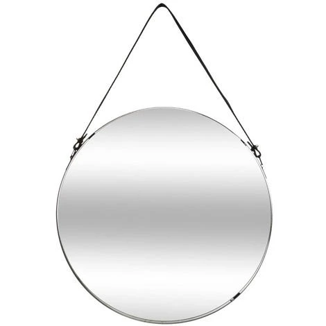 Atmosphera – Miroir Ă suspendre en mĂ©tal lanière imitation cuir D 38 cm (-) Dimensions Produit : D. 38 x Ep. 3 cm. – Matière du cadre : Fer –