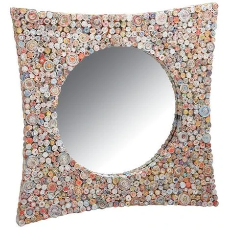 Le Miroir carré incurvé en papier recyclé est constitué d’une glace ronde bordée de rouleaux de papier multicolores de récupération…