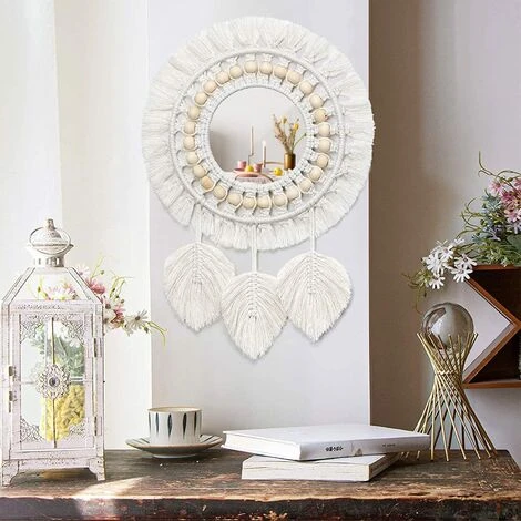 【Beau Design Minimaliste】 Miroir en macramé unique avec pendentif plume qui attire le regard et rend votre pièce élégante. Il ajoutera une sensation d’espace à votre pièce et apportera une touche bohème folk et vintage à votre intérieur.【Matériau de Haute Qualité】 Il est fait de coton, de perles de bois et de miroir, durable, résistant à l’usure et respectueux de l’environnement, très délicat et pratique. Le miroir est tissé avec une forme sunburst. Conception de processus de tissage exquise, élégante et chic.【Taille et Détails】 Le diamètre total avec les franges est de 32 cm, le diamètre du miroir est d’environ 16 cm. REMARQUE-Il y a un film protecteur sur la surface du miroir. Veuillez le déchirer avant utilisation pour assurer sa haute résolution.【Décoration d’art élégante】 Le miroir mural rond en macramé donne une pièce dans la conception de votre maison. Tissé à la main avec un cordon en coton de haute qualité et un miroir. En plus d’être un miroir, c’est un choix idéal pour une décoration intérieure de style rétro.【Large Application】 Le miroir boho est un excellent art mural décoratif. Vous pouvez le placer dans votre salon, dortoir, chambre, salle de bain, chambre d’enfant et tout autre endroit où vous souhaitez avoir une vue forte. C’est aussi une belle idée de cadeau pour un festival, un anniversaire, etc.