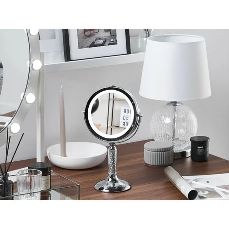 Miroir de table grossissant avec Ă©clairage LED. ComplĂ©tez votre salle de bains ou votre espace maquillage avec ce miroir de table LED au design moderne. Le cadre en acier robuste est dotĂ© d’une finition argentĂ©e qui met magnifiquement en valeur la base dĂ©corĂ©e et vous pouvez facilement passer du cĂ´tĂ© standard au cĂ´tĂ© grossissant grâce au mĂ©canisme de pivotement.
