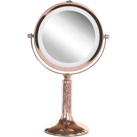 Miroir de table grossissant avec éclairage LED. Complétez votre salle de bains ou votre espace maquillage avec ce miroir de table LED au design moderne. Le cadre en acier robuste est doté d’une finition rose dorée qui met magnifiquement en valeur la base décorée et vous pouvez facilement passer du côté standard au côté grossissant grâce au mécanisme de pivotement.
