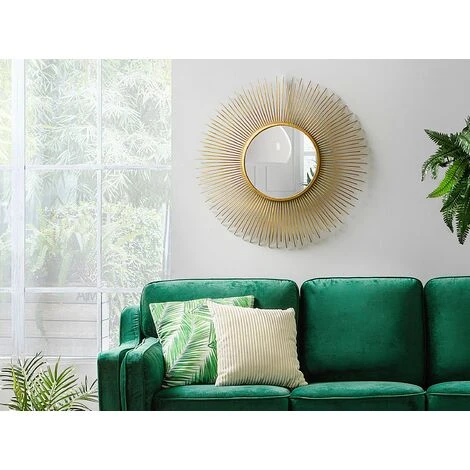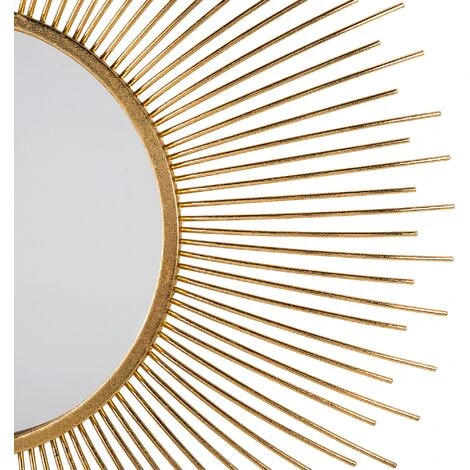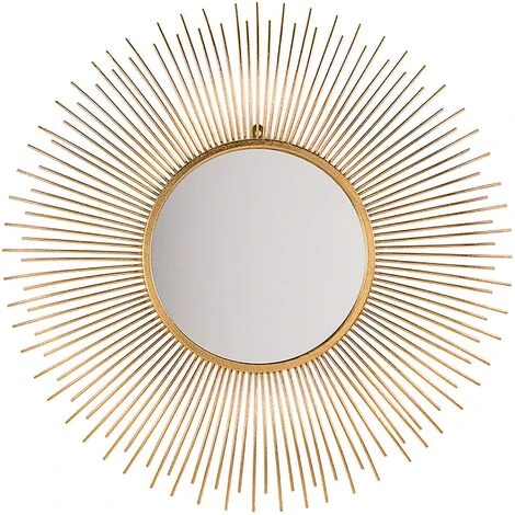 Miroir mural doré en forme de soleil. Ce miroir doré donnera à votre maison ou appartement un éclat magnifique ! Le design fantaisiste du cadre en forme de soleil convient parfaitement aux intérieurs éclectiques, vintage et boho, en créant un accent mural attrayant. Le miroir peut être utilisé à la fois comme élément décoratif et miroir de maquillage.
