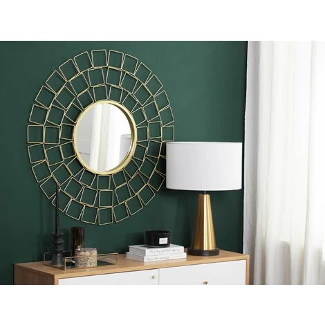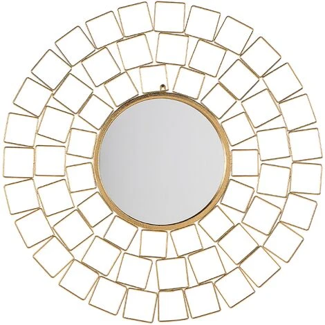 Miroir mural dorĂ© avec cadre moderne. Ce miroir rond entourĂ© de son cadrage deviendra la pièce maĂ®tresse de votre intĂ©rieur. FabriquĂ© en mĂ©tal dans un design ajourĂ© et gĂ©omĂ©trique avec une finition dorĂ©e pour un effet glamour, il fera assurĂ©ment tourner tous les regards vers lui. Parfait pour embellir votre espace mural et crĂ©er de l’espace dans votre intĂ©rieur, ce miroir correspond parfaitement aux styles boho et vintage.