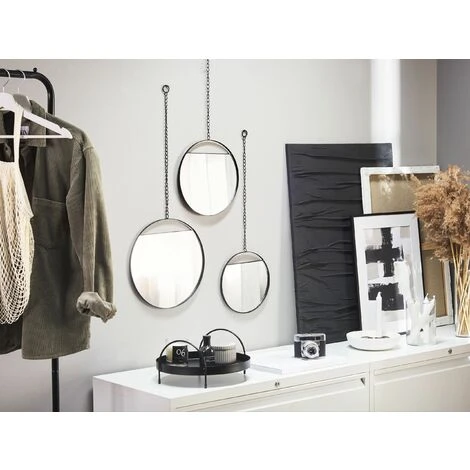 3 miroirs ronds avec cadres en acier noir et chaĂ®nes de suspension. Bien que ces 3 miroirs soient des miroirs principalement dĂ©coratifs, ils assurent aussi une image fidèle et agrandissent visuellement l’espace. On les imagine accrochĂ©s dans une entrĂ©e ou au-dessus d’une coiffeuse et associĂ©s Ă un mobilier blanc ou de couleur claire (les contrastes sont toujours en vogue !). Pour assurer une rĂ©sistance accrue Ă la corrosion, leurs cadres mĂ©talliques ont Ă©tĂ© enduits de poudre. Remarquez les dĂ©tails et le design unique : ces miroirs sont suspendus sur des chaĂ®nes – une solution idĂ©ale pour complĂ©ter un dĂ©cor industriel et moderne. Chacun de ces miroirs ronds a une taille diffĂ©rente, ce qui permet de changer de configuration Ă chaque fois que vous en avez envie. Malin n’est-ce pas ?