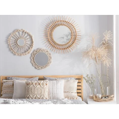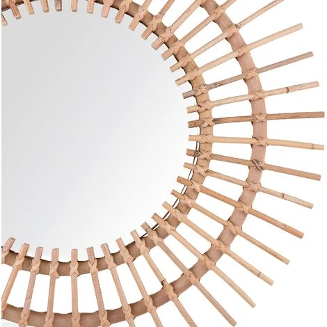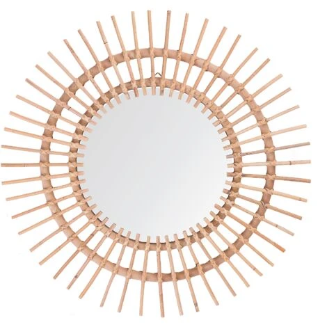 Miroir mural rond au style rustique en rotin clair. Ajoutez une touche d’ambiance boho Ă votre couloir ou Ă votre salon avec ce merveilleux miroir en rotin en forme de soleil. Construit sur un cadre en rotin, il s’adapte très bien comme un miroir fonctionnel dans un couloir ou comme dĂ©coration dans un salon.