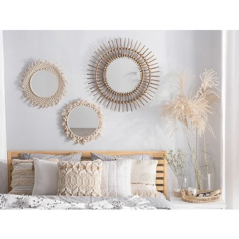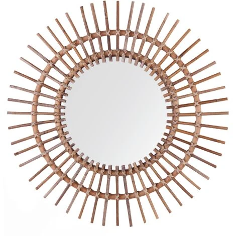 Miroir mural rond au style rustique en rotin foncé. Ajoutez une touche d’ambiance boho à votre couloir ou à votre salon avec ce merveilleux miroir en rotin en forme de soleil. Construit sur un cadre en rotin, il s’adapte très bien comme un miroir fonctionnel dans un couloir ou comme décoration dans un salon.