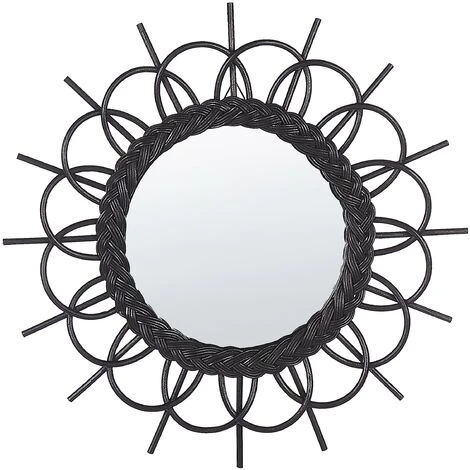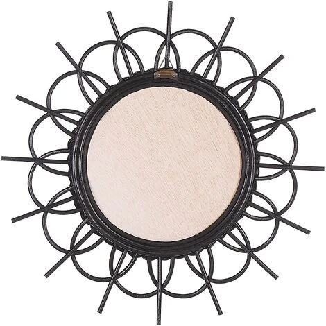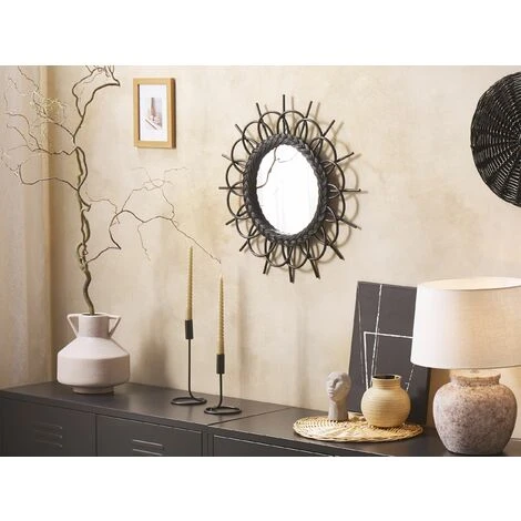 Miroir rond avec cadre soleil. Un miroir est un élément indispensable à tout espace de vie. Non seulement il peut agrandir optiquement la pièce, mais le bon design peut attirer l’attention et ajouter une ambiance particulière à votre maison. Cette pièce y parviendra certainement, car elle présente un cadre en forme de soleil, fabriqué en rotin naturel de couleur noire. Il est donc facile à entretenir et durable, ce qui signifie que le miroir rehaussera l’aspect de votre espace pendant des années.