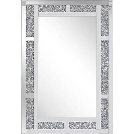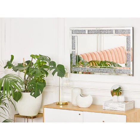 Miroir mural rectangulaire avec cadre décoratif argenté effet cristaux. Le cadre brillant et très décoratif à cristaux en verre acrylique (plexiglass) fait de ce miroir un véritable bijou glamour qui soulignera parfaitement le décor de votre intérieur. Accrochez-le en face d’une fenêtre pour immédiatement agrandir la pièce, au-dessus d’une table de chevet pour un effet déco sublime ou dans le couloir pour une touche de style chic. Ce superbe miroir enrichira votre maison en y ajoutant beaucoup de lumière. Vous allez l’adorer !