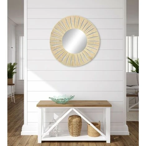 Ajoutez de la luminosité à votre intérieur avec le miroir Malaysia de 50 cm de diamètre et son cadre rotin en forme de soleil. Son style moderne et tendance en font un miroir incontournable pour votre décoration. Il dispose d’un miroir central de 25 cm de diamètre. Ce miroir mural se fixe à un mur grâce à son accroche au dos.