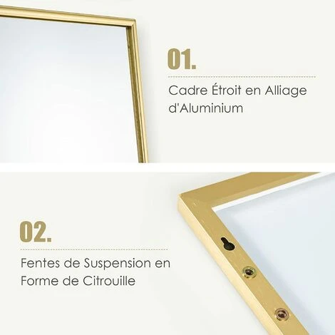 - Si vous manquez d’espace mais que vous avez toujours besoin d’un miroir pleine longueur, essayez ce miroir rectangulaire suspendu ! Le miroir vous offre 2 options de montage. L’une consiste Ă accrocher le miroir au mur avec les vis d’expansion incluses. L’autre consiste Ă accrocher le miroir au-dessus de la porte avec les crochets inclus. Les deux mĂ©thodes sont pratiques et suffisamment robustes. De plus, les crochets de suspension comportent 6 trous prĂ©-percĂ©s, offrant diffĂ©rentes positions de suspension pour vous permettre de rĂ©gler la hauteur de visualisation. De plus, le miroir pleine longueur est sĂ»r avec un verre incassable et durable avec un cadre en alliage d’aluminium robuste. Il sera parfait pour la chambre, le salon ainsi que l’entrĂ©e.
