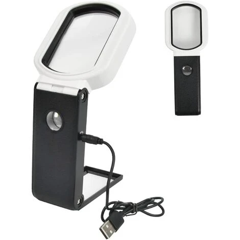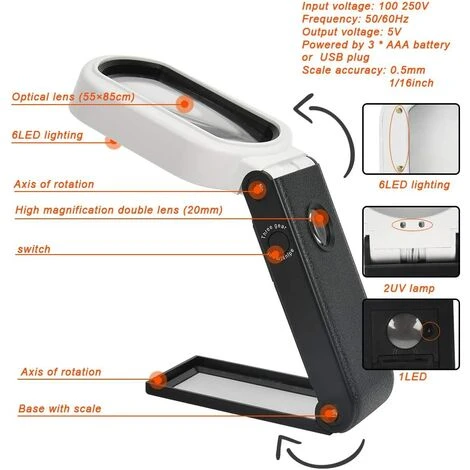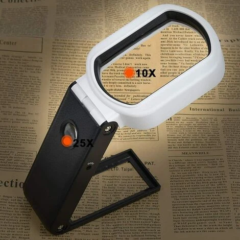 [2 grossissements et superbe matériau] Il y a un grossissement 10x (grande lentille) et 25x (petite lentille) pour la lecture. Fabriqué en matériau acrylique, ces lentilles peuvent garantir une image claire sans distorsion. [3 lumières LED pour une lecture facile] Livrée avec une lumière LED et une lumière UV, la loupe peut aider à lire plus claire, même la nuit. Si vous voulez régler la luminosité, vous devez appuyer sur le bouton pour basculer de manière ordonnée entre 6 LED (lentille 10 fois), 1 LED (lentille 25 fois) et 2 lampes UV (lentille 10 fois), et éteindre lorsque vous appuyez sur le bouton pour la 4ème fois. [Utilisée à la main/sur la table] La loupe de lecture avec large poignée peut être maintenue fermement dans votre main. Ou dépliez le support à l’arrière, placez la loupe LED sur la table pour libérer vos mains. [Pour divers besoins] La loupe lumineuse LED est adaptée pour lire des journaux, des livres, des magazines, des cartes, réparer des circuits et faire des travaux manuels. Très utile pour les personnes qui ont une vision faible ou malheureuse. [Alimentée par batterie/prise USB] La loupe de poche peut être alimentée par 3 piles AAA 1,5 V (non incluses dans le paquet) ou un câble de charge USB. Ces deux blocs d’alimentation sont adaptés pour une utilisation en intérieur et en extérieur.