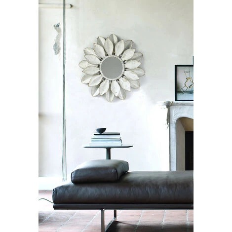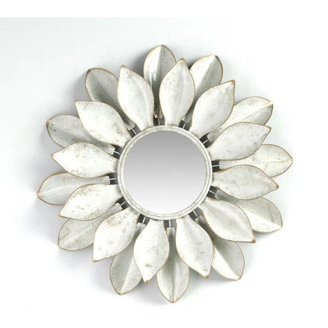 Décoration murale métallique en forme de fleur avec le miroir circulaire au centre. Le bord de chaque pétale a des touches en doré de même que la laque blanche a des touches vintages. Cette décoration apportera modernité et simplicité sans être trop voyant.