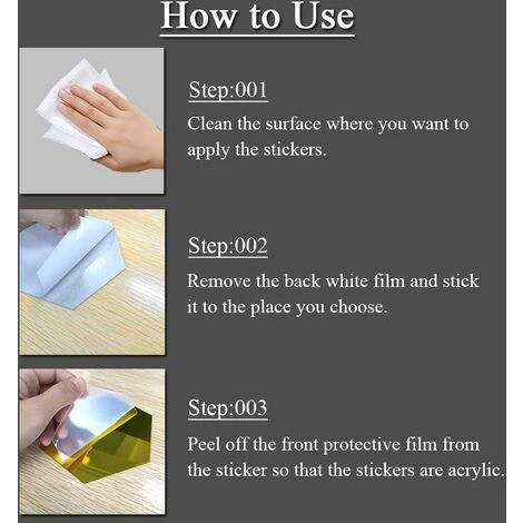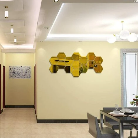 Matériau : ces autocollants muraux hexagonaux sont fabriqués en acrylique. La surface est réfléchissante, dorée et le dos a de la colle elle-même. Il y a un film protecteur sur la surface du miroir pour éviter les rayures.