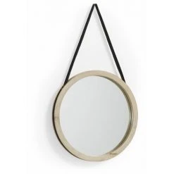 Miroir rond en bois de manguier massif naturel avec poignée en cuir synthétique.