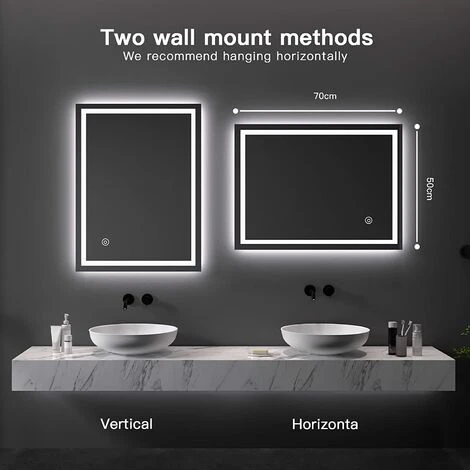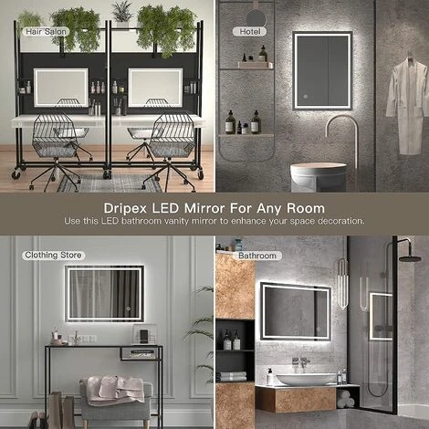 INSTALLATION VERTICALE/HORIZONTALE. Le miroir de salle de bain Dripex peut être accroché dans 2 directions, 50 x 70 cm ou 70 x 50 cm. Ce miroir de salle de bain peut être rapidement fixé au mur. Les accessoires de montage nécessaires.