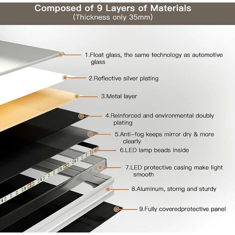 ÉCONOMIE D’ÉNERGIE. Miroir mural avec technologie LED moderne et économe en énergie, classe d’efficacité énergétique A++, durée de vie maximale de 3 ans, avec une faible consommation d’énergie, vous pouvez profiter d’un éclairage naturel.Verre renforcé de 4 mm avec film antidéflagrant.