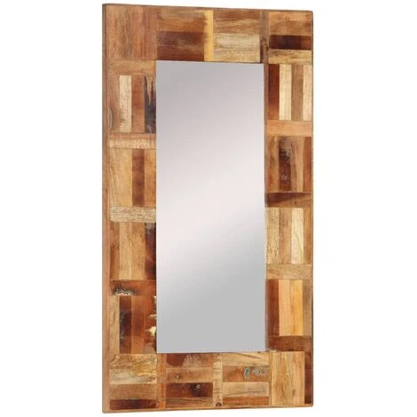 Ce miroir mural en bois d’aspect ancien est un supplĂ©ment pratique et dĂ©coratif Ă votre salle de bain, chambre Ă coucher ou dressing. Le miroir mural est fabriquĂ© Ă la main Ă partir de bois de rĂ©cupĂ©ration solide, une combinaison de bois rĂ©cupĂ©rĂ©s y compris le teck, le bois de manguier, le pin, le hĂŞtre, etc. Ces bois sont recyclĂ©s Ă partir de vieux bâtiments tels que des usines, des hangars et des bateaux. Cela en fait une excellente option Ă©cologique dans la fabrication de meubles. Comme chaque pièce est faite Ă la main, les couleurs varient avec de nombreuses nuances de bleu, vert, crème et parfois orange, rouge et rose rĂ©vĂ©lĂ©es. Cela signifie mĂŞme que chacune est unique ! Les signes d’usure et la structure visible du grain tĂ©moignent de la riche histoire du bois et donnent au miroir un aspect chaleureux et authentique. Chaque Ă©tape du processus est rĂ©alisĂ©e avec le plus grand soin, qu’il s’agisse du polissage, de la peinture ou du laquage. Il est prĂŞt Ă ĂŞtre fixĂ© au mur grâce au crochet dĂ©jĂ installĂ© sur le panneau arrière. Remarque importante : les couleurs varient d’une pièce Ă l’autre, ce qui rend chacun de nos miroirs unique ; la livraison est alĂ©atoire.