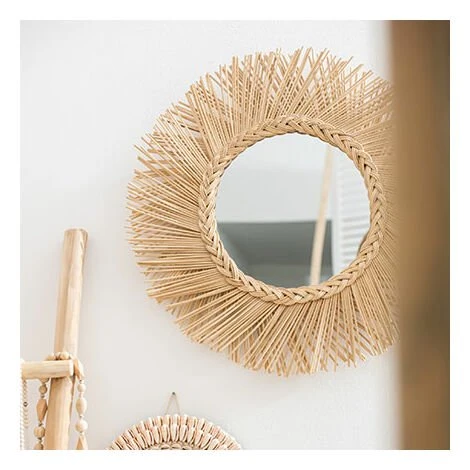 Créez une ambiance conviviale dans votre salon à travers ce miroir tressé rond en rotin naturel. Le style en forme de rayons de soleil se présente sur les bordures du verre à travers des lambeaux de rotin finement ciselés, tout en respectant la forme circulaire. Ces matières naturelles sont entrecroisées et forment une large surface autour du verre, solidement tissées sur la circonférence. La qualité de la finition s’observe également par la couleur naturelle du rotin, ce qui est compatible avec un mur aux couleurs chaudes ou neutres. L’aspect rustique de votre salon est d’autant plus accentué par la présence de ce miroir.