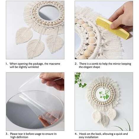 Film de protection Afin de mieux protéger le miroir, nous avons placé un film protecteur sur la surface du miroir. Veuillez le déchirer avant utilisation pour garantir sa haute définition. Ce miroir mural moderne et élégant deviendra une superbe décoration pour votre chambre ou n’importe quelle pièce de votre maison. Le macramé sera désordonné pour la boîte pliante. Et nous avons fourni un peigne pour vous permettre de peigner la frange en macramé.