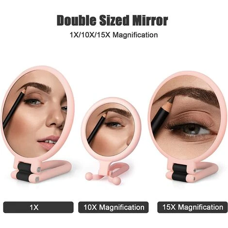 - 【MIRROIR GROSSISSANT 1/10/15X】: Le paquet contient DEUX grossissements (10X/15X), les deux sont des miroirs double face avec un miroir commun d’un côté et un miroir grossissant de l’autre côté. Il est très approprié pour le maquillage, les soins quotidiens du visage et le traitement des détails du visage : coupe des sourcils, élimination de l’acné, lentilles de contact, etc.