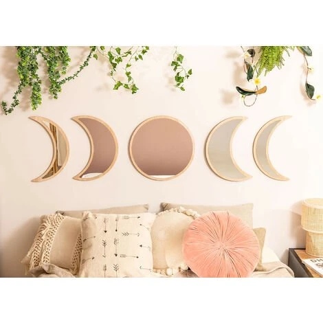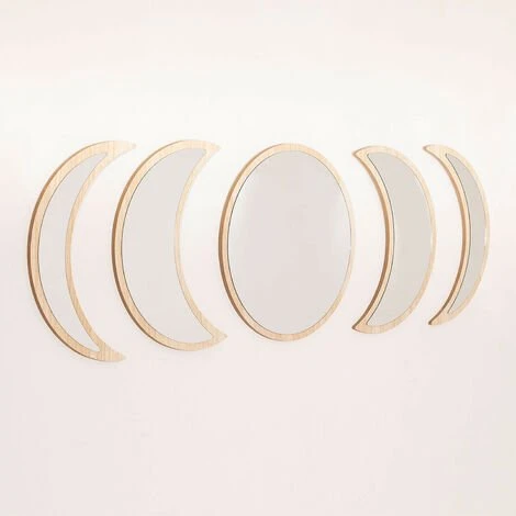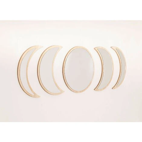 Nos Miroirs Muraux en Bois 5 pièces Estel séduisent autant que ce qu’ils représentent, les phases lunaires. Chaque pièce est l’un des changements de la lune, passant par chacune de ses étapes. Le cadre de chaque miroir est en bois de pin non traité avec une finition naturelle et grâce à leurs tailles vous pouvez les placer n’importe où dans votre maison, aussi bien verticalement comme horizontalement. Nouvelle lune, croissant de lune, pleine lune et dernier quartier habilleront les murs de votre entrée, salon ou chambre et créeront un environnement très naturel et subtil qui s’accordera parfaitement avec chaque styles décoratifs tels que naturel, bohème ou méditerranéen. Nous vous recommandons de les nettoyer avec un chiffon humide, en évitant l’utilisation de produits chimiques . Les fixations au mur ne sont pas inclus. Dimensions (Hauteur x Largeur x Profondeur): 40 cm x 9 – 40 cm x 1 cm IMPORTANT : Le service standard porte-à-porte ne comprend pas la livraison et la collecte des marchandises au domicile du client, qui sont à la charge de ce dernier. Il est possible que le livreur aide volontairement à la livraison de la marchandise (ceci est totalement volontaire pour le livreur et la société de transport et ne relève pas de la responsabilité de Sklum).L’assemblage n’est pas non plus inclus.