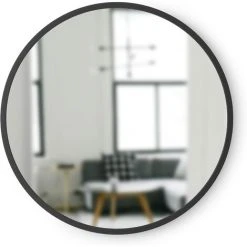 Ce miroir apporte beaucoup de personnalité à la pièce dans laquelle il est accroché, avec sa forme moderne et le revêtement en caoutchouc noir qui adoucit sa silhouette. Sa petite taille (40 cm) lui permet d’être installé même dans de petites pièces ou sur des pans de murs trop petits pour un grand miroir.