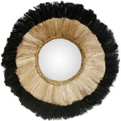 Composé de feuilles d’abaca naturelles, cet objet déco se distingue par le travail des fibres végétales. La superposition de deux couronnes aux coloris contrastés séduit par son mouvement. La technique de tressage met en valeur une matière proche de la feuille de bananier. La texture offre ainsi des reliefs qui accentuent la présence de ce miroir au charme bohème.