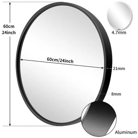 - [Design a la mode] Le diamètre du miroir rond est de 60 cm.Avec un élégant cadre en aluminium étroit de 0,8 cm, il peut être utilisé dans les couloirs, les salles de bain, les salons, etc. L’épaisseur de l’ensemble du cadre est d’environ 2,1 cm, ce qui a l’air classique, sûr et stable, et peut efficacement éviter d’endommager vos murs.