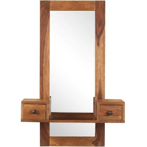 Ce miroir cosmétique en bois de Sesham solide avec 2 tiroirs latéraux apportera une touche pratique et attrayante à votre salle de bain ou votre chambre à coucher avec son design unique. Cette table d’appoint est en bois de Sesham solide. Le Sesham est un bois dur tropical qui est non seulement célèbre pour ses grains riches, mais également connu sous le nom de bois de rose ou de palissandre. Ce miroir de décoration est entièrement fait à la main. Ses beaux grains de bois rendent chaque meuble unique et légèrement différent l’un de l’autre. Chaque étape du processus est réalisée avec le plus grand soin, que ce soit le polissage ou le laquage. Le miroir de maquillage est facile à assembler. Remarque importante : les grains de bois et les couleurs peuvent varier d’une pièce à l’autre, ce qui rend chacun de nos miroirs de décoration unique. La livraison est aléatoire.