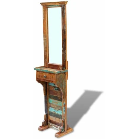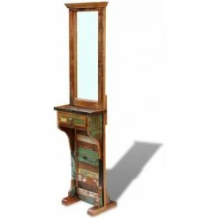 Ce grand miroir de couloir en verre est fait à partir du magnifique matériau durable qu’est le bois de récupération massif, un bois qui possède les caractéristiques d’autres bois comme le sesham, le teck, la palissandre, le manguier, l’acacia, le bois recyclé, le bois dur, etc, ainsi qu’un style rétro de par sa présence. Le tiroir sous le miroir peut contenir bien des objets de valeur. Des traces colorées de peinture sur le cadre contribuent à son aspect esthétique et en font une décoration pratique et très attrayante pour votre pièce. Ce miroir autonome peut également être utilisé comme miroir de salle de bains ou comme coiffeuse. Entièrement fait à la main, chaque étape du processus de fabrication de ce miroir est effectuée avec le plus grand soin, qu’il s’agisse du polissage, de la peinture ou du cirage. N.B. : Les couleurs peuvent varier d’un meuble à l’autre, ce qui rend chacun de nos miroirs unique. La livraison est aléatoire.