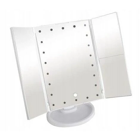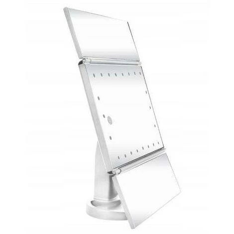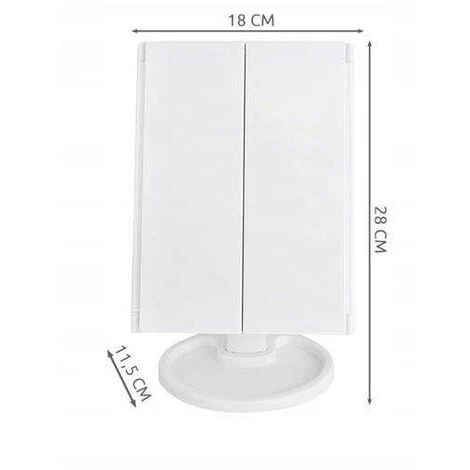 le miroir a deux miroirs latéraux, sur le côté gauche nous avons un miroir ordinaire sans grossissement, tandis que sur le côté droit il y a un grossissement double et triple. L’élargissement est d’une grande aide lors de vos séance de maquillage ou de la chirurgie. Nous n’avons pas besoin de nous rapprocher du miroir pour faire une ligne parfaitement uniforme au-dessus de l’œil, il suffit de regarder le miroir latéral et de se maquiller.RÉGLAGE DE L’INCLINAISON – grâce à la possibilité de régler l’inclinaison du miroir dans la plage de 180 °, vous pouvez facilement ajuster sa position à vos propres besoins et préférences actuels. Vous n’avez pas besoin de soulever le miroir et de le déplacer vers les étagères supérieures et inférieures pour créer un maquillage parfait – ajustez simplement l’angle d’inclinaison et vous éclairerez parfaitement chaque partie de votre visage. Le miroir peut également être réglé horizontalement jusqu’à 90°. – le miroir a jusqu’à 22 LED, qui sont positionnées sur ses bords. Cette disposition des LED permet une visibilité complète de chaque partie du visage, du décolleté ou du cou. L’intensité de l’éclairage LED peut être réglée à l’aide d’un bouton tactile situé au bas du miroir. une base stable et large du miroir garantit la sécurité d’utilisation. Le miroir ne basculera pas même lors de manipulations fréquentes et collera parfaitement au plateau de table même à l’inclinaison maximale. Le support est également équipé d’un évidement pratique dans lequel vous pouvez ranger de petits objetsCaractéristiquescouleur blancheplage de réglage : vertical 180°, horizontal 90°alimentation : 4 piles AA 1,5V (non fournies) ou câble micro-USB (fourni)dimensions miroir plié (longueur/largeur/hauteur) : 11,5/18/28cmdimensions du miroir déplié (longueur/largeur/hauteur) : 11,5/34,5/28cmpoids de l’ensemble : 700 gpoids avec emballage : 875gINCLUSmiroircâble micro-USB